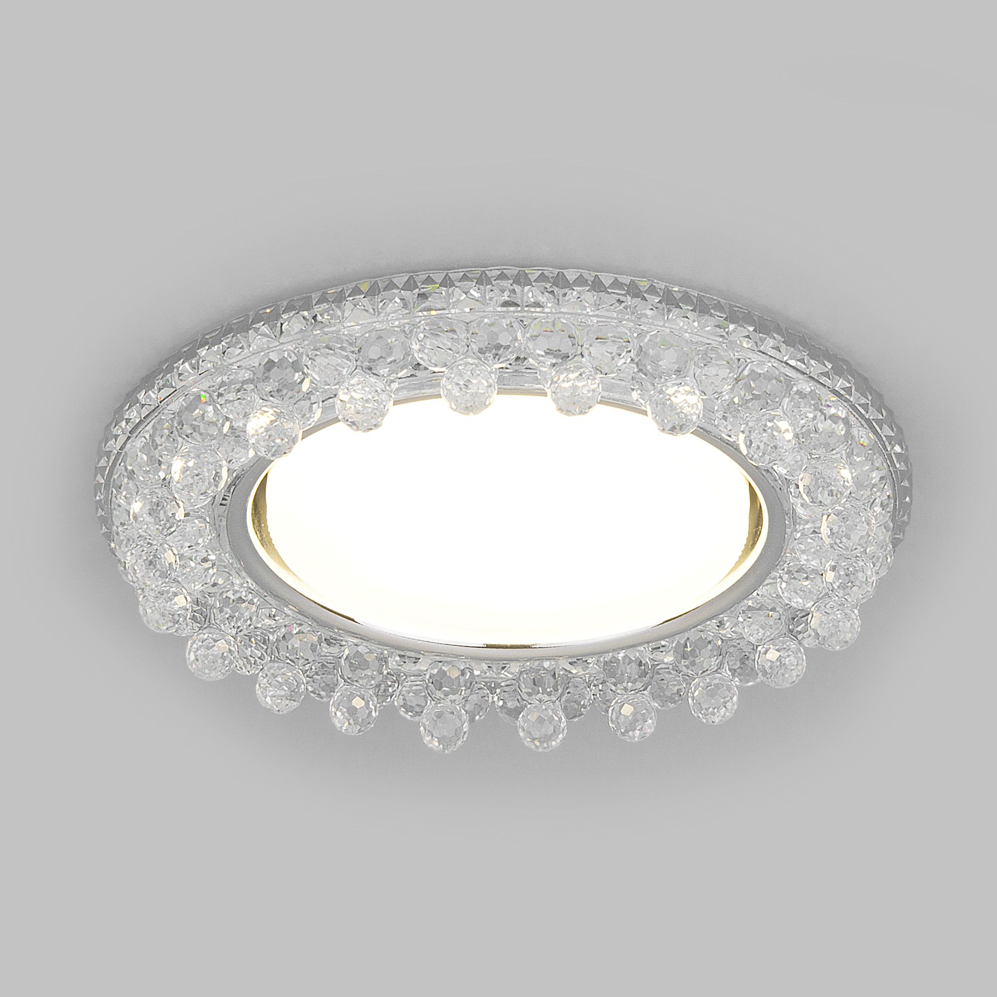 Точечный светильник со встроенной LED подсветкой 3025 GX53 CL используется для создания основного и дополнительного освещения и в качестве эффектных декоративных элементов светового дизайна. Хрустальный декор светильника преломляет свет и создает яркие и переливающиеся блики. Потолочный светильник работает в трех режимах: подсветка, лампа и подсветка+лампа. Для дополнительного источника света в интерьере предлагаем купить встраиваемый светильник, который легко монтируется в натяжные и подвесные потолки и гипсокартонные конструкции. За счет небольшой погружной глубины светильник существенно экономит высоту потолков. • Встроенная LED подсветка; • 3 режима работы; • Хрустальный декор.